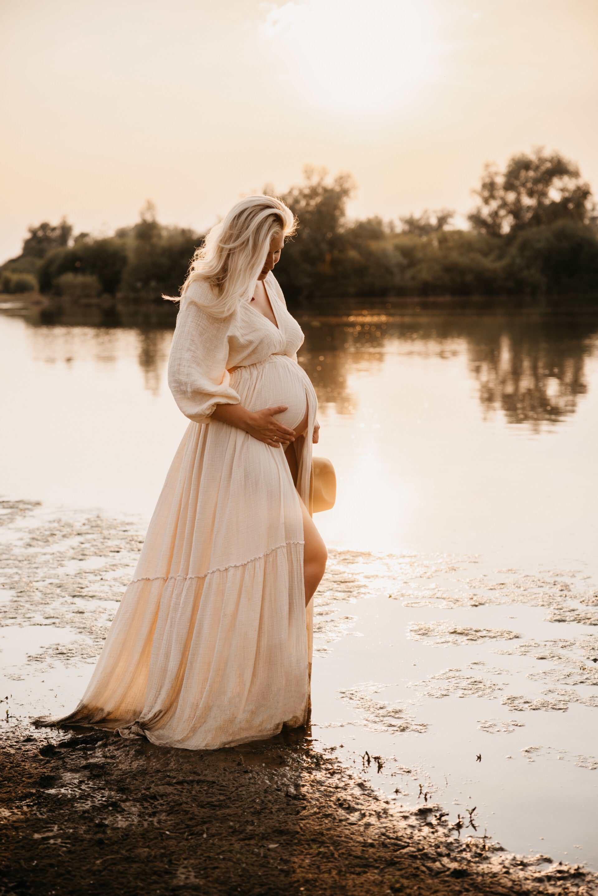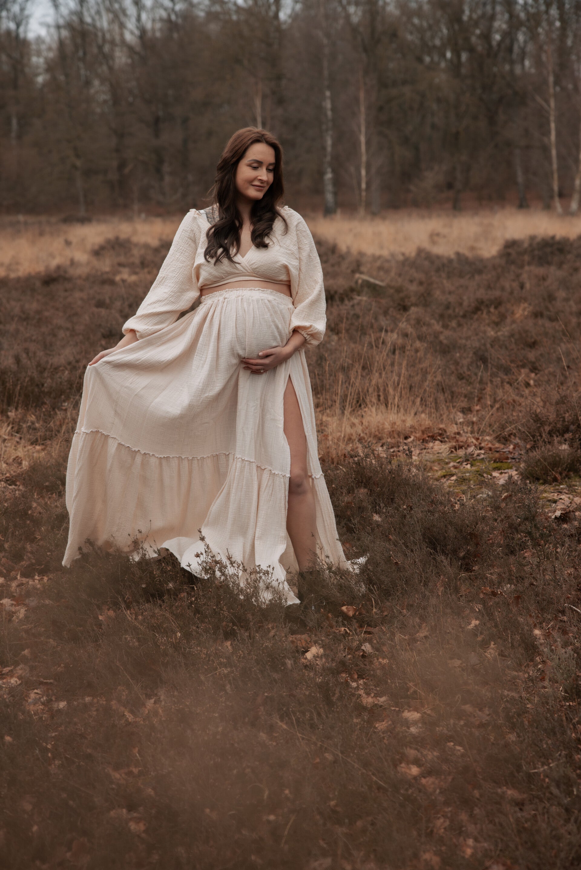 Dress Meacy is een prachtige tweedelige jurk in een beige kleur met een mooie strik op de achterzijde. Je kunt de rok prachtig boven of onder de buik dragen.