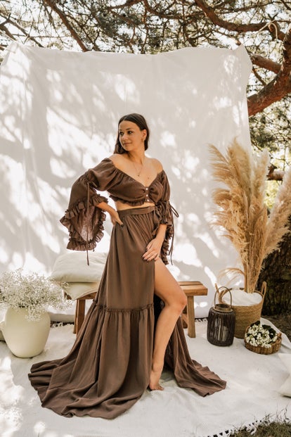 Dress Jasmine is een prachtige tweedelige BOHO set in een prachtige bruine kleur. De top heeft super mooie sierlijke mouwen. Deze set is een echte eyecatcher voor jouw foto's.